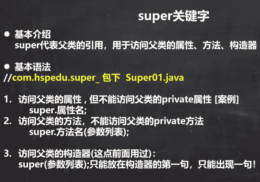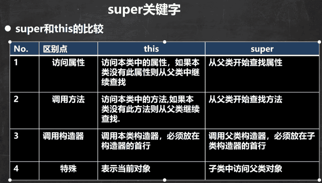 this只能出现在构造方法和实例方法(这个实例方法也就是不带static关键字的方法)之中,代表的是当前正在调用这个方法的对象super在构造器中是默认存在的,前提是构造器中没有this语句,因为如果你输入了this语句那么该语句就会替换掉默认的super语句super也只能出现在构造方法和实例方法中,代表的是当前对象的父类型特征super必须放在构造器中的第一行(super只能在构造器中使用 ),this也是必须放在构造器中的第一行,所以super和this不能写在一起,在构造器中如果写了this方法,那么默认的super方法就会被this替换掉