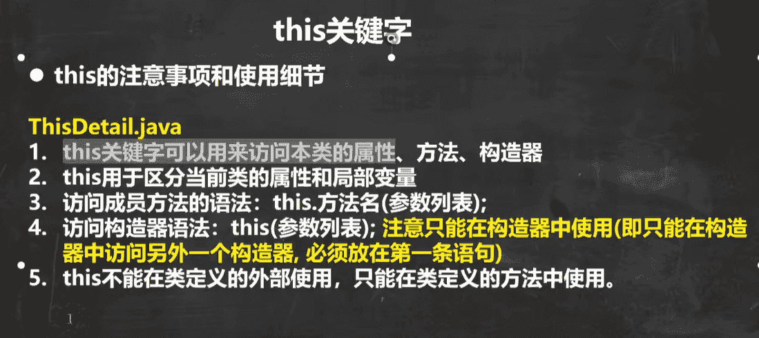 this关键字调用别的构造器class This { public This() { // 调用构造器 /* 注意事项 如果想用this关键字去调用别的构造器 前提是该this关键字只能在构造器中使用 this语句调用别的构造器要放在第一条 */ this("张三", 18); } public This(String name, int age) { System.out.println(name); System.out.println(age); } } public class this02 { public static void main(String[] args) { This t = new This(); t.This2(); System.out.println("This结束"); } }