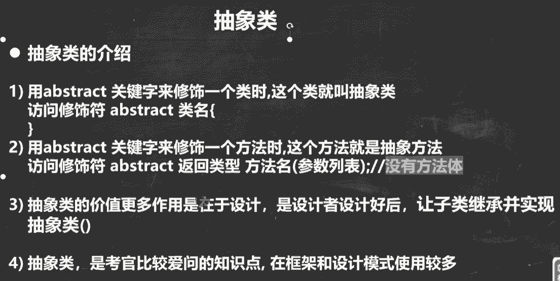 一个类中的某些方法,需要声明,但又不确定如何实现时,则可以将其声明为抽象方法(用abstract