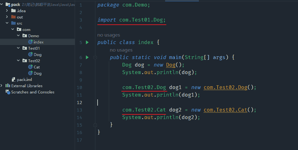 注意,导包只能到一个,因为在Java中相同的类不能调用两次(就算是不同包的相同类也不行),所以,为了导入另一个类,则需要输入完整的包名加类名
