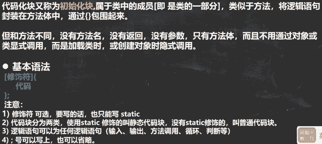 - 代码块就相当于是另一种形式的构造器(也就是对构造器的补充),可以做到初始化的作用