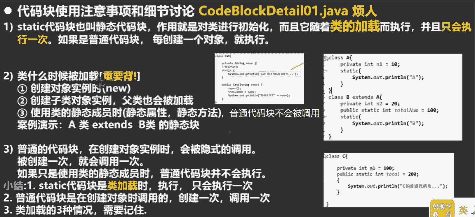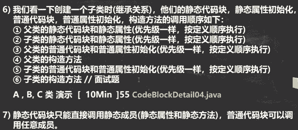 关键字,所以调用子类的构造器时则会优先调用父类中的构造器,在调用构造器之前会优先调用代码块,所以当我们调用子类时则会优先调用父类中的代码块,其次在调用父类中的构造器,然后在调用子类中的代码块,最后在调用子类中的构造器,这样以此类推调用静态成员(静态方法和静态变量)时,普通代码块不会被调用,但是静态代码块会被调用
