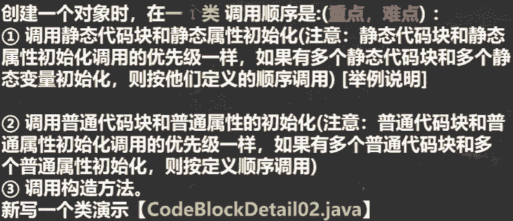 调用完之后在执行普通代码块静态代码块只能调用静态的方法和属性,普通代码块则可以调用任意的方法和属性