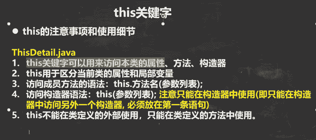 关键字调用别的构造器class This { public This() { // 调用构造器 /* 注意事项 如果想用this关键字去调用别的构造器 前提是该this关键字只能在构造器中使用 this语句调用别的构造器要放在第一条 */ this("张三", 18); } public This(String name, int age) { System.out.println(name); System.out.println(age); } } public class this02 { public static void main(String[] args) { This t = new This(); t.This2(); System.out.println("This结束"); } }
