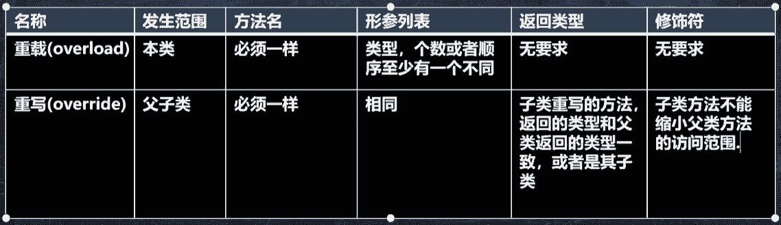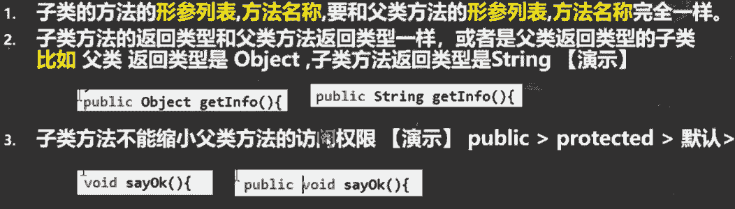 - 子类中方法的方法名称和参数(形参列表)要和父类中的方法一致