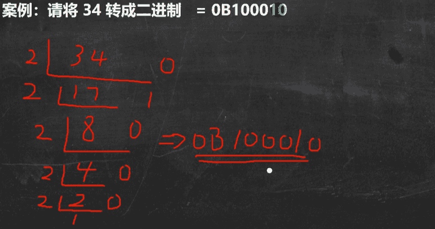 余数从最底下开始写,然后就得到 100010 ,这就是十进制34的二进制数
