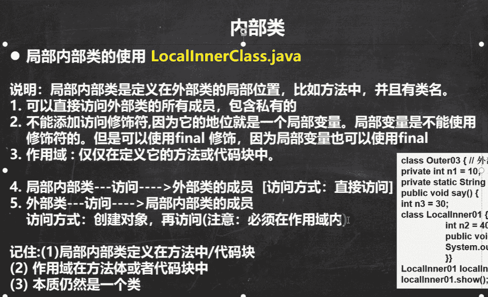 - 内部类只能在定义它的方法体内或则代码块中使用