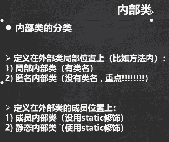 - 内部类有局部内部类、匿名内部类、成员内部类和静态内部类
