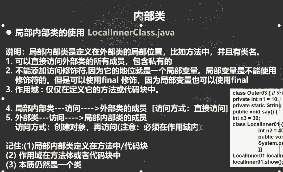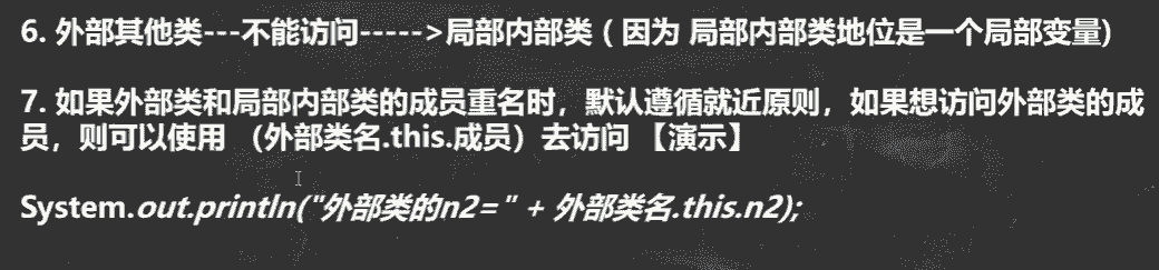 - 外部类要调用内部类,则要在定义内部类的方法体中或则代码块中创建对象