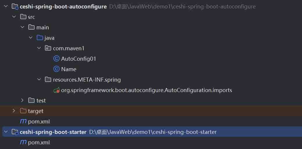 import org.springframework.boot.context.properties.EnableConfigurationProperties; import org.springframework.context.annotation.Bean; import org.springframework.context.annotation.Configuration; @Configuration @EnableConfigurationProperties(Name.class) public class AutoConfig01 { @Bean public Name Name() { return new Name(); } }resources/META-INF/spring/org.springframework.boot.autoconfigure.AutoConfiguration.imports
